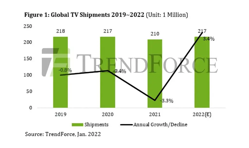 در سال 2021 چیزی در حدود 210 میلیون دستگاه انواع تلویزیون در سراسر جهان به فروش رفت که طبق داده های TrendForce بین 7 تا 8 میلیون دستگاه بالاتر را در سال 2022 شاهد خواهیم بود. تلویزیون های زیر 29 اینچ 25 درصد کل فروش را تشکیل داده و تلویزیون های 40 تا 59 اینچ نیز 55 درصد کل آمار فروش را به خود اختصاص داده اند.