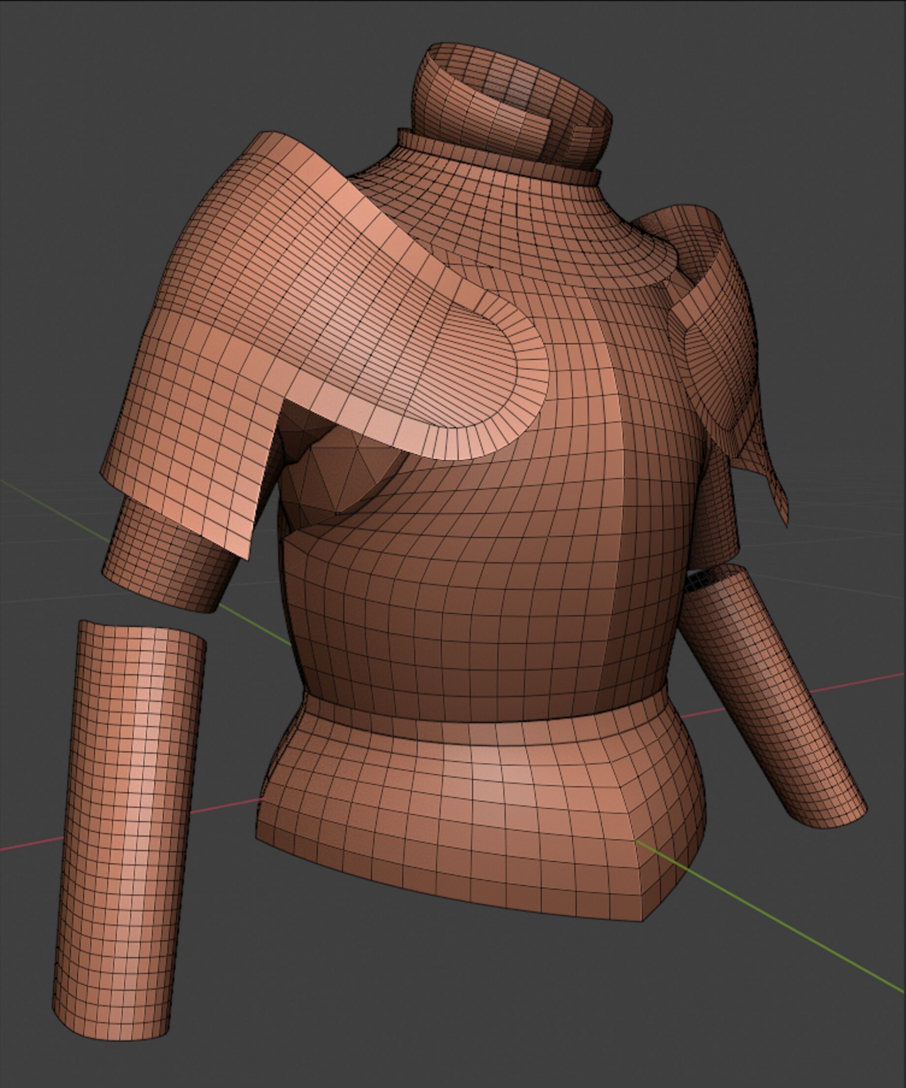این روش کنترل بسیار دقیقی بر کانتورهای سطوح پیچیدهای مانند قطعات کمر، سینه و گردن زره فراهم کرد. قطعات بازو به مراتب سادهتر و به صورت استوانههای مخروطی بودند. شانهها فقط مجموعهای از extrusionها بودند، یقه یک دایره بود که در امتداد یک منحنی loft شده بود، و مش پایه زره زنجیری (chain mail) شامل یک جفت icosphere میشد.