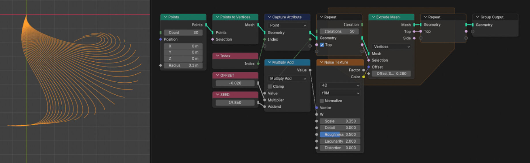 یکی از روشهای ابتکاری برای ایجاد فرهای تزئینی هندسه، استفاده از تکنیک curl noise است. این کار با extrusion یک لبه از طریق یک فیلد نویز (noise field) انجام میشود، به طوری که خروجی نویز به عنوان جهت extrusion مورد استفاده قرار میگیرد. اگر نقاط متعددی در مکانهای مختلف extrusion شوند، میتوانیم فیلد نویز را تجسم کنیم. یک رویکرد جایگزین استفاده از چندین نقطه در یک مکان است که هر کدام نویز کمی متفاوتی را نمونهبرداری میکنند، یا با تغییر مقیاس (scale) یا seed. این کار منجر به ایجاد خوشههای زیبایی میشود که میتوان آنها را به مشهایی با موتیفهای برگی شکل تبدیل کرد.