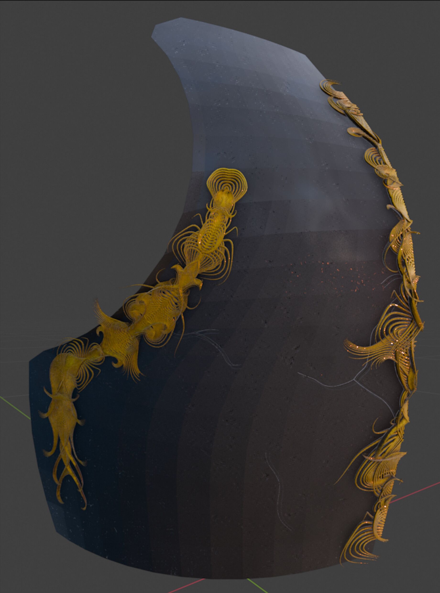 خود طلاکاریها صرفاً بخشهای کوچکی از curl noise هستند که آینهای شده و سپس در یک خط مستقیم نمونهسازی شدهاند. سپس این خط طلا به منحنیای که از مش پایه استخراج شده، تغییر شکل داده میشود.