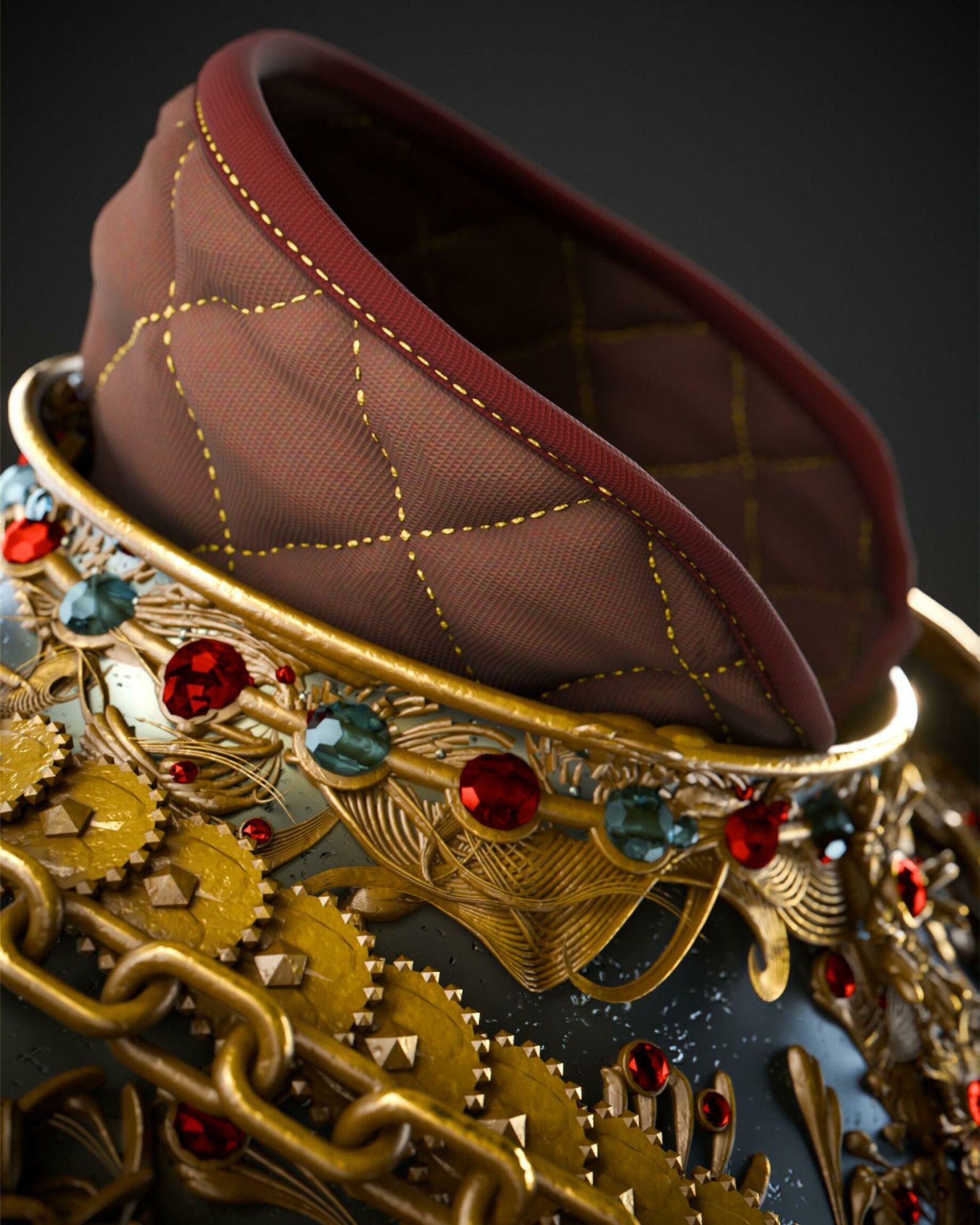 هنگامی که منحنیها را از یک نقطه واحد با یک offset نویز خفیف ایجاد میکنیم، میتوانیم چیزی بسیار تزئینی بسازیم، و وقتی این طرح آینهای (mirrored) شود، حتی هدفمندتر به نظر میرسد. این فرآیند برای تزئینات اضافی و همچنین دکوراسیون روی بروچها (brooches) مورد استفاده قرار گرفت و به تکمیل طراحی زره تشریفاتی کمک شایانی کرد.