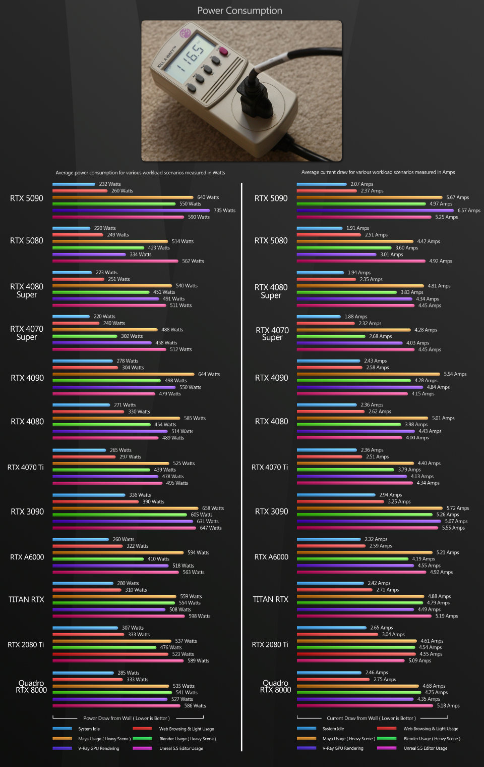 برای تست مصرف انرژی GPUها، من مصرف برق کل سیستم تست را از پریز برق با استفاده از یک متر P3 Kill A Watt اندازهگیری کردم. از آنجا که ماشین تست یک سیستم Threadripper پرمصرف است، ارقام من بالاتر از اکثر ورکاستیشنهای DCC خواهد بود.