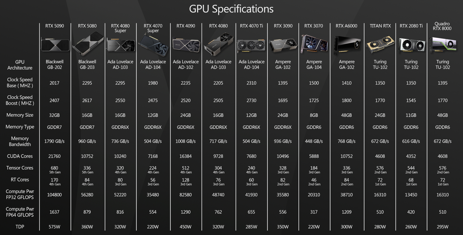 در ادامه، بیایید نگاهی به مشخصات فنی GPUهای جدید بیندازیم. شما میتوانید تحلیلهای عمیق معماری Blackwell GPU را در سایتهای خبری فناوری عمومی پیدا کنید، بنابراین من در اینجا بر مشخصاتی تمرکز خواهم کرد که بیشترین ارتباط را با عملکرد نرمافزارهای CG دارند.