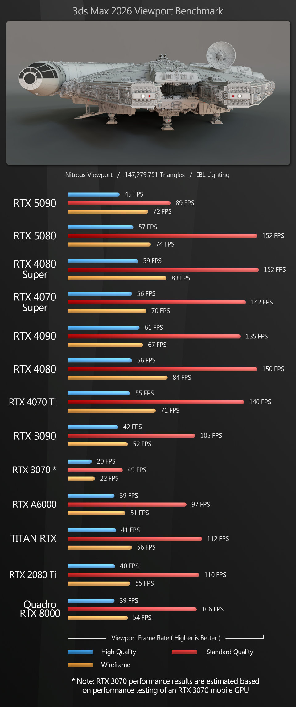 در بنچمارکهای Viewport، امتیازات نرخ فریم نشاندهنده ارقامی است که هنگام دستکاری داراییهای سهبعدی نمایش داده شده به دست آمده است و برای حذف ناهماهنگیها، میانگین پنج جلسه تست گرفته شده است. در تمام بنچمارکهای رندرینگ، CPU غیرفعال شد تا فقط از GPU برای محاسبات استفاده شود. سیستم تست یک جفت نمایشگر ۳۲ اینچی را با رزولوشن اصلی ۳۸۴۰ در ۲۱۶۰ اجرا میکند، اما هنگام تست عملکرد Viewport، ویوپورت نرمافزار به نمایشگر اصلی محدود شد: هیچگونه گسترش (Spanning) در چند نمایشگر مجاز نبود.