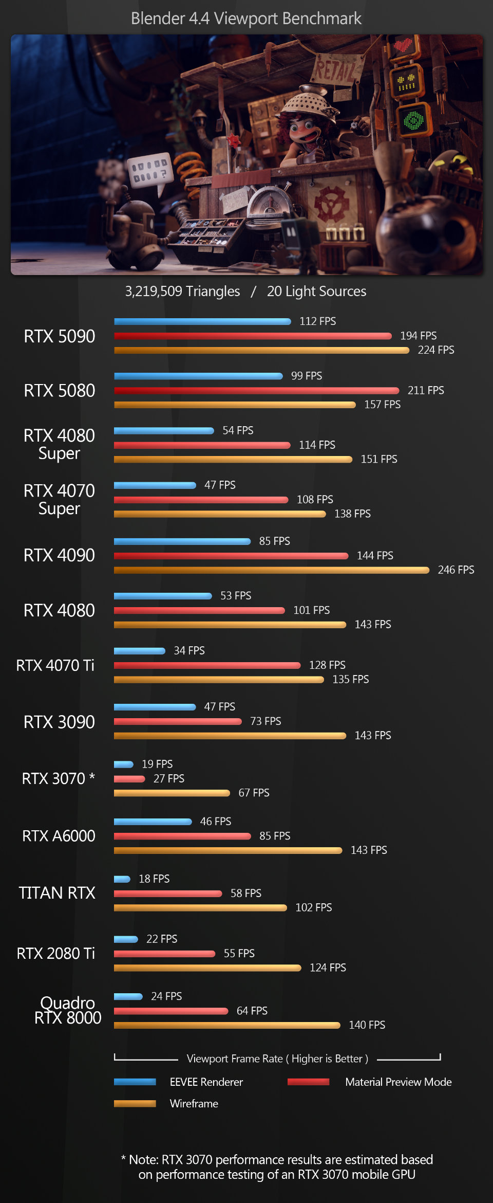 Blender: بلندر اولین تستی است که در آن GPUهای جدید Blackwell واقعاً در حالتهای نمایش مختلف میدرخشند. GeForce RTX 5090 با رندر Eevee با اختلاف بسیار زیاد رتبه اول را میگیرد و تنها در حالت Wireframe به GeForce RTX 4090 میبازد. GeForce RTX 5080 درست پشت سر 5090 با Eevee قرار میگیرد، اما در حالت Material Preview واقعاً از آن پیشی میگیرد. در حالت Wireframe، این کارت هم به GeForce RTX 4090 میبازد، اما تمام GPUهای دیگر در تست را شکست میدهد.