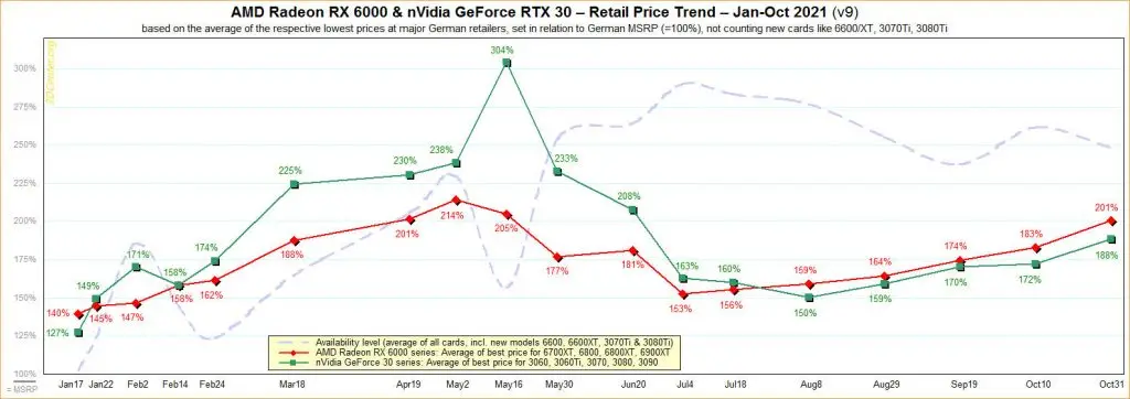 در حال حاضر کارت های گرافیک AMD Radeon RX 6000 بیش از 101 درصد گران تر از قیمت های اعلامی کمپانی یا همان MSRP هستند. کارت های گرافیک انویدیا مقداری ارزان تر بوده و حداکثر 88 درصد از قیمت اعلامی MSRP است.